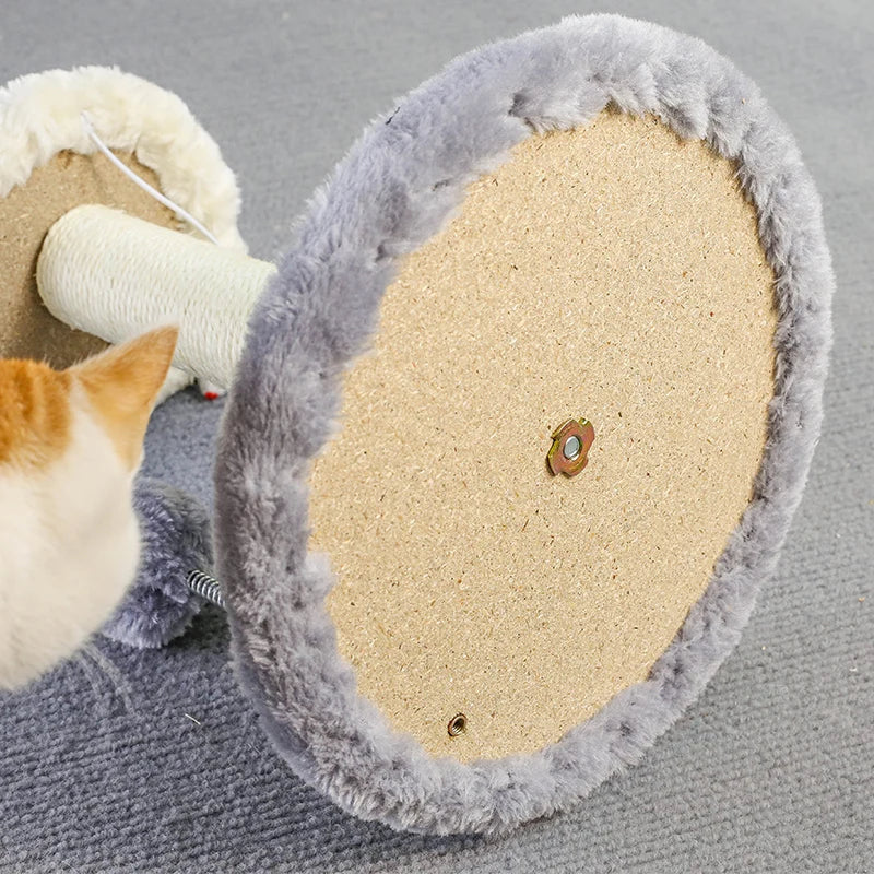 Sa structure comprend une planche de base solide, des bâtons à gratter résistants, une boule suspendue captivante et une plate-forme en forme de fruit ou de fleur. Cette combinaison ingénieuse crée un espace de jeu polyvalent qui stimule l'instinct naturel de votre chat à griffer, grimper et se reposer.